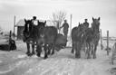 Evert o Lars Svensson kör gödsel med hästar o släde i Vallby. |