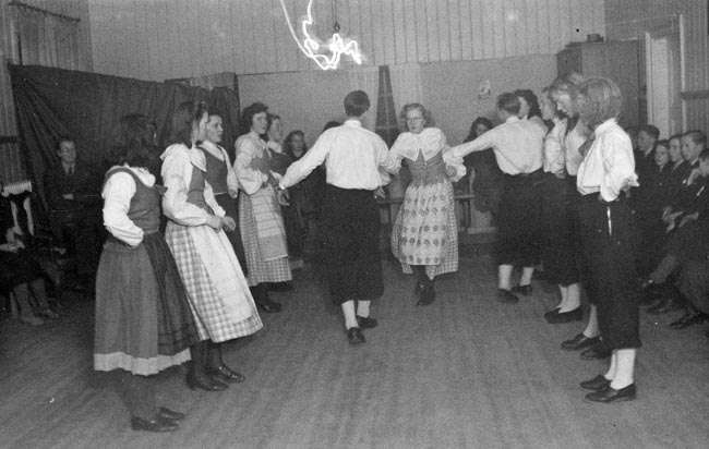 Ekby kyrkliga ungdomskrets avskedssamkväm för pastor Larsson. Folkdansuppträdande i folkskolan Ekby. |
