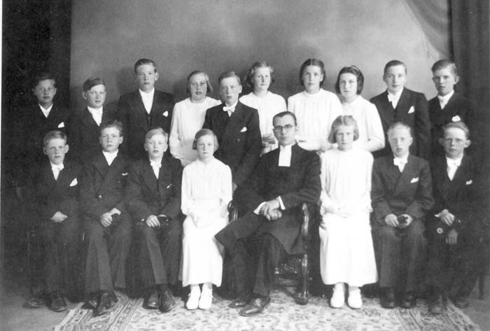 1937 6-38 Konfirmation 1937 Överst.Valdemar Larsson, August Eriksson, Stig Eriksson, Ingvar Johansson, Herbert Vest, Lennart Johansson-Vågemo, Kurt Svensson, Harry Johansson, Egon Segerstedt. Mitten. Sven Breman Erik Larsson, Per-Erik Gunnarsson, Ingrid Jonsson-Nilsson, Prästen Ragnar Ernås, Margit Johansson-Andersson, Lennart Johansson, Åke Gunnarsson, Bengt-Olof Beckman. Underst. Eivor Dahlgren, Kerstin Lövgren, Anna-Lisa Johansson, Birgit Hermansson, Gunvor Karlsson-Pettersson, Ingrid Johansson, Tyra Karlsson, Gunvor Ljungberg-Andersson. |