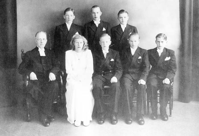 1932 10-25 Konfirmation 1932 Stående Gunnar Roslund, Nils Jarl, Prästen Hugo Nordner, Nils Pauli, Åke Dalberg. Sittande Rosa Berqström, Svea Johansson, Ingrid Gustavsson, Märta Wilsson, Valborg Hermansson, Inga-Lisa Svensson, Ingrid Almen, |
